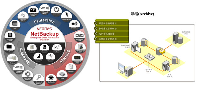「備份復原與歸檔」(Backup Recovery & Archive)解決方案協助企業保護最重要的資產。資料每年呈倍數成長、持續累積,連帶資料管理成本也不斷增加,加上各國政府法規皆要求資料的安全保存,資料保護是資訊管理人員不容忽視的重點。資料的備份與復原能夠在企業IT環境中,伺服器的檔案和應用程式資料發生毀損、意外刪除或硬體故障時,可靠且及時地加以復原。除此之外針對企業內各類非結構化資料形態(例如Microsoft Office文件檔案)及Microsoft Exchange電子郵件透過各種層級制定策略的方式,對應用程式進行掃描並自動將資料搬遷至歸檔區域,以滿足各項法律、法規或遵從性要求,另外透過歸檔的功能也可協助企業回收主要的儲存空間,確保可預測的儲存容量標準。