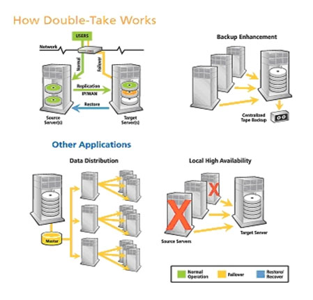 Double-Take 屬於 Host-based 的異地備援解決方案,僅需在參與備援的主機上各安裝一套 Double-Take 軟體即可並與儲存架構或硬體設備無關,因此可適合任何客戶的 IT 環境,快速建構異地備援系統。